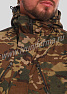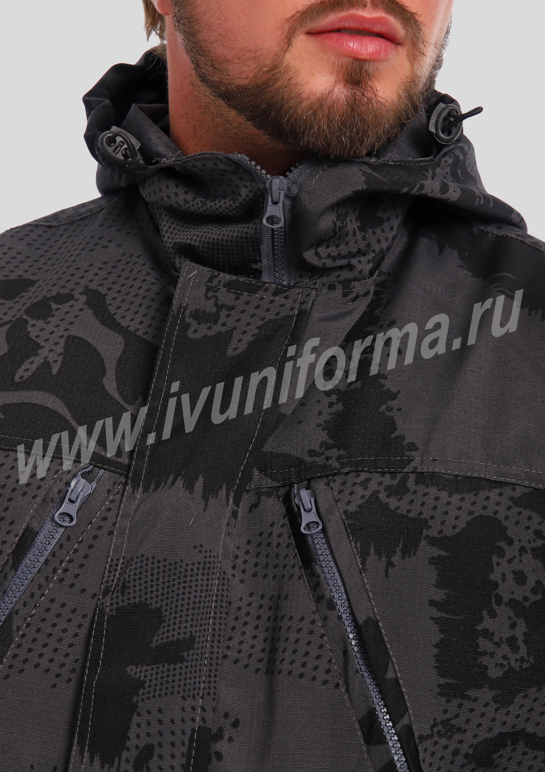 Костюм мужской состоит из куртки и брюк. Куртка удлиненная прямого силуэта, с застежкой на тракторную молнию с ветрозащитным клапаном на липучках "Velcro", воротник-стойка. На куртке два нагрудных кармана с косым входом на молнии и два нижних накладных кармана с клапанами и застежками на липучку "Velcro". Куртка имеет капюшон с возможностью регулировки объема . На рукавах куртки расположены карманы с застёжкой на молнию.