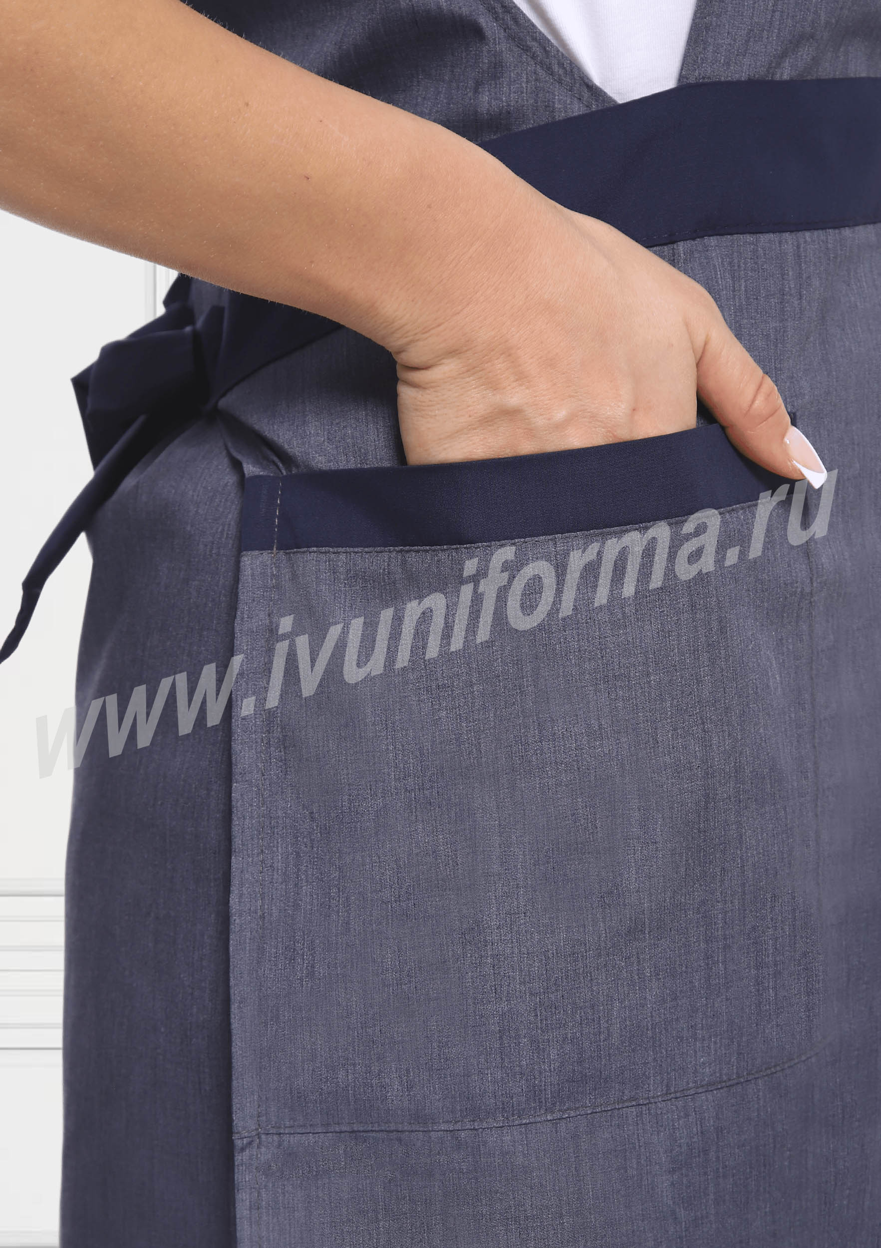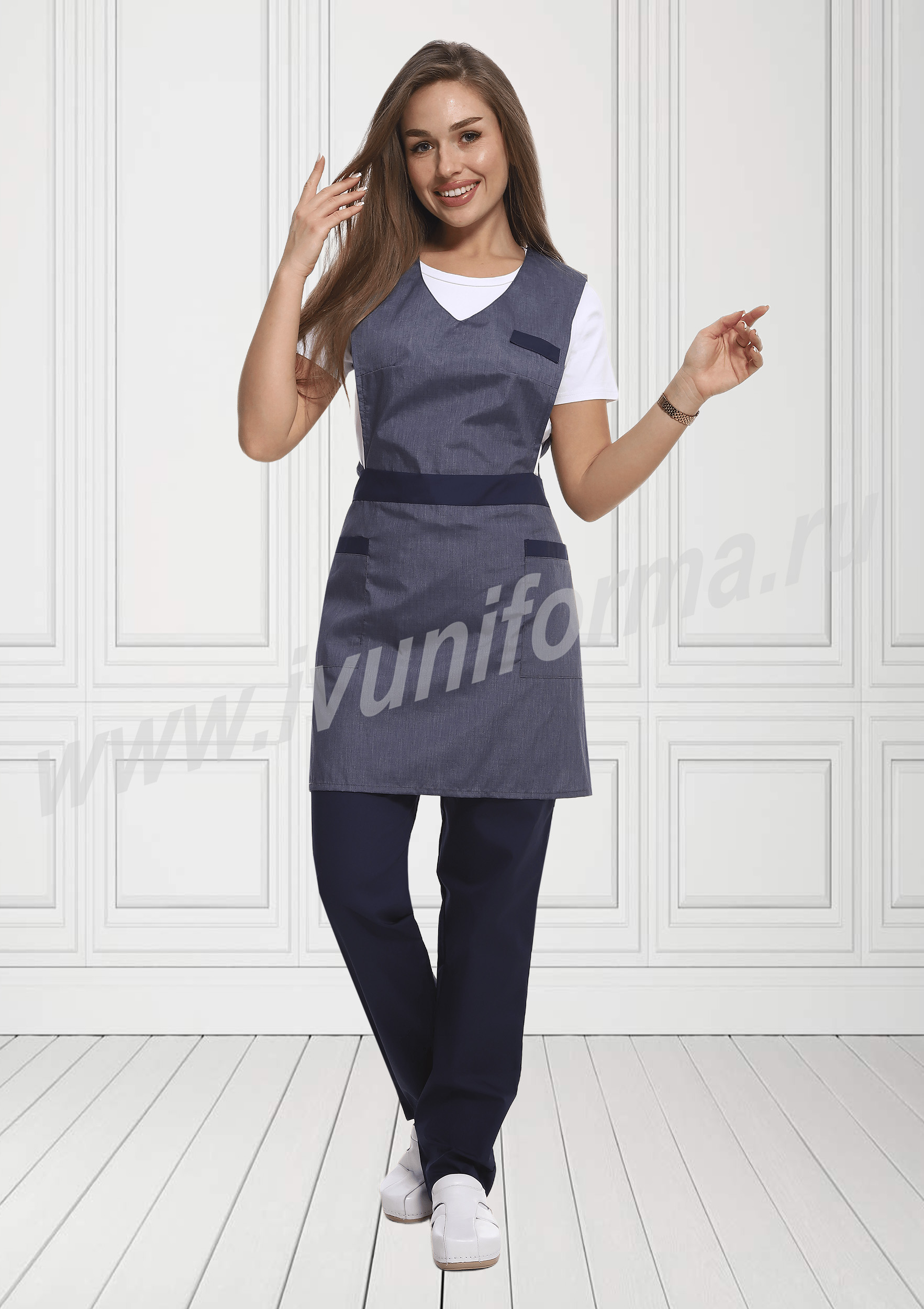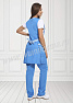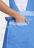 Костюм женский состоит из фартука и брюк. Фартук средней длины, перекидной. Спинка прямая без отделки. Грудка с округлым вырезом горловины, с нагрудными вытачками и листочкой контрастного цвета. Нижняя часть отрезная с широким поясом контрастного цвета, с двумя вместительными накладными карманами с контрастной отделкой. Брюки с высокой посадкой, прямые на эластичном поясе со вставкой для комфортной посадки по линии талии. Костюм выполнен из легкой и прочной смесовой ткани с водоотталкивающей пропиткой, удобен в использовании и прост в уходе. Костюм предназначен для защиты от общепроизводственных загрязнений в разных сферах деятельности.